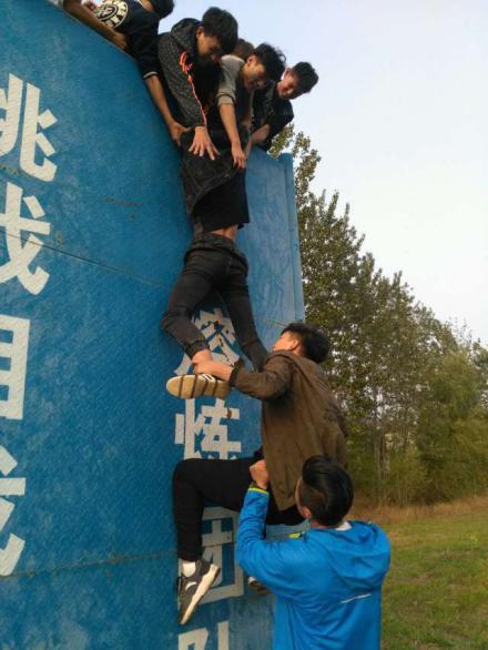 翻越“生死墙”是一个高4.2米的直墙,要求不借助任何外来力量,每一个人都要翻越这个“生死墙”。为了完成这个任务男生们用宽厚的肩膀为大家做底座形成一个人梯,最先上去的人探下身来去拉下面的人,下面的人尽量向上推,其余的人在周围做起了一层“保护气垫”,所有人都齐心协力,无一例外!