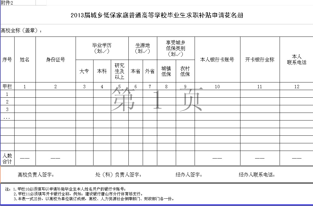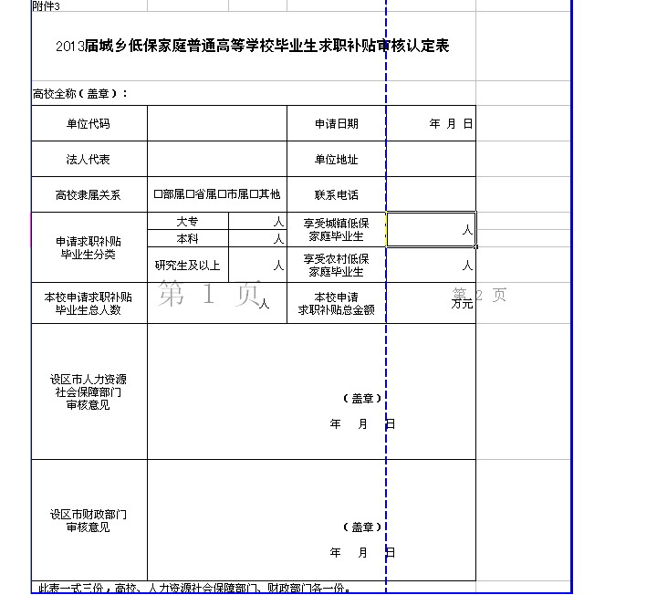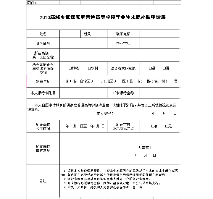 2013届城乡低保家庭普通高等学校毕业生求职补贴申请表